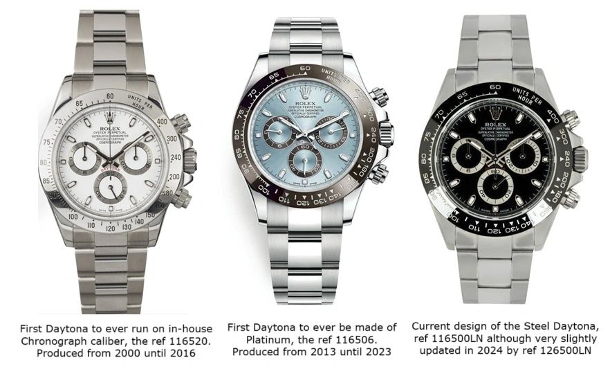 - Ref. 6241 (1965–1969): Introduced the black acrylic bezel insert, giving the Daytona a more modern, sportier look.